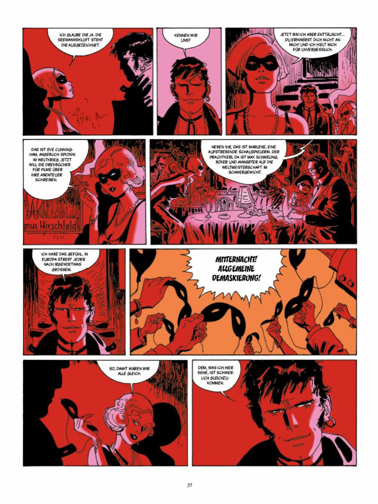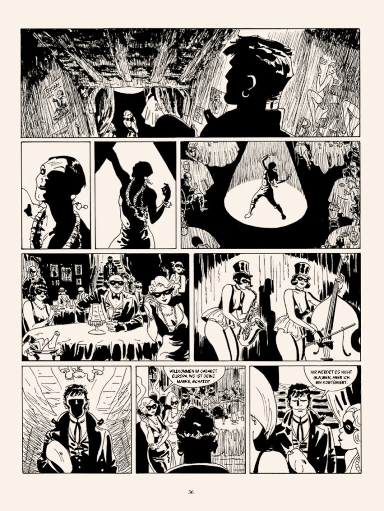 Daran merkt man wie kunstvoll und lesenswert die „Corto Maltese“-Reihe auch in den aktuellen Ausgaben ist. Die Lektüre regt zum Vertiefen und Nachforschen an. Die Geschichten wollen an der historischen Realität gemessen werden und immer auch eine historische Situation beleuchten. Die deutsche Hauptstadt in „Nacht in Berlin“ befindet sich gerade am Kipp-Punkt wo die „Goldenen Zwanziger“ mit ihren Exzessen und Freiheiten von der wieder erstarkten, nationalen, patriotischen Spießigkeit eingefangen wird, die letztlich in den Faschismus mündete.