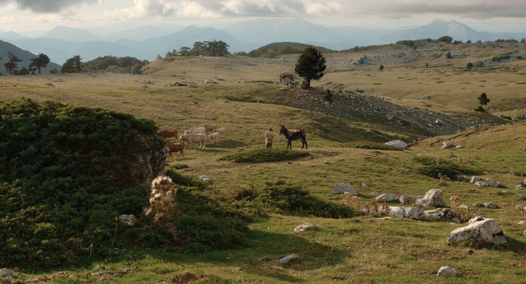 Zunächst aber dämmert es langsam und das Publikum blickt aus dem Dunkel einer Höhle auf einen azurnen Himmel. Wenig später schiebt sich ein Rind ins Bild und blickt zurück in den Abgrund. Die Kamera – und damit auch die Zuschauer:innen – klettern hinaus und nehmen den Blick ins Tal wahr. Eine majestätische Berglandschaft eröffnet sich bis zum Horizont. Im Tal zu Füßen des Blickpunktes eine Herde Rinder.