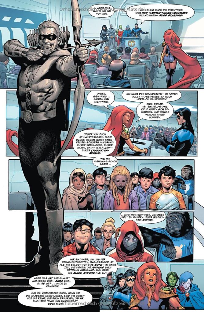 Autor der Serie ist Tim Sheridan („Shazam – Im Reich der Verdammnis“), der das Geschehen mit wechselnden Illustratoren-Teams von der Einschulung bis zur Versetzung ins Ziel bringt. Es gibt den Handlungsbogen mit Red X der 5 US-Ausgaben umfasst, aber eigentlich so etwas wie ein roter Faden ist. Einige Abenteuer sind in einer Heft abgeschlossen und das Batpack bekommt auch einen eigenen Slot. Dann noch einen 3 Hefte langen Ausflug mit Shazam und Dane in die Hölle. Und eine abschließende Reifeprüfung. Also ist wohl für alle potentiellen Leser:innen etwas dabei.