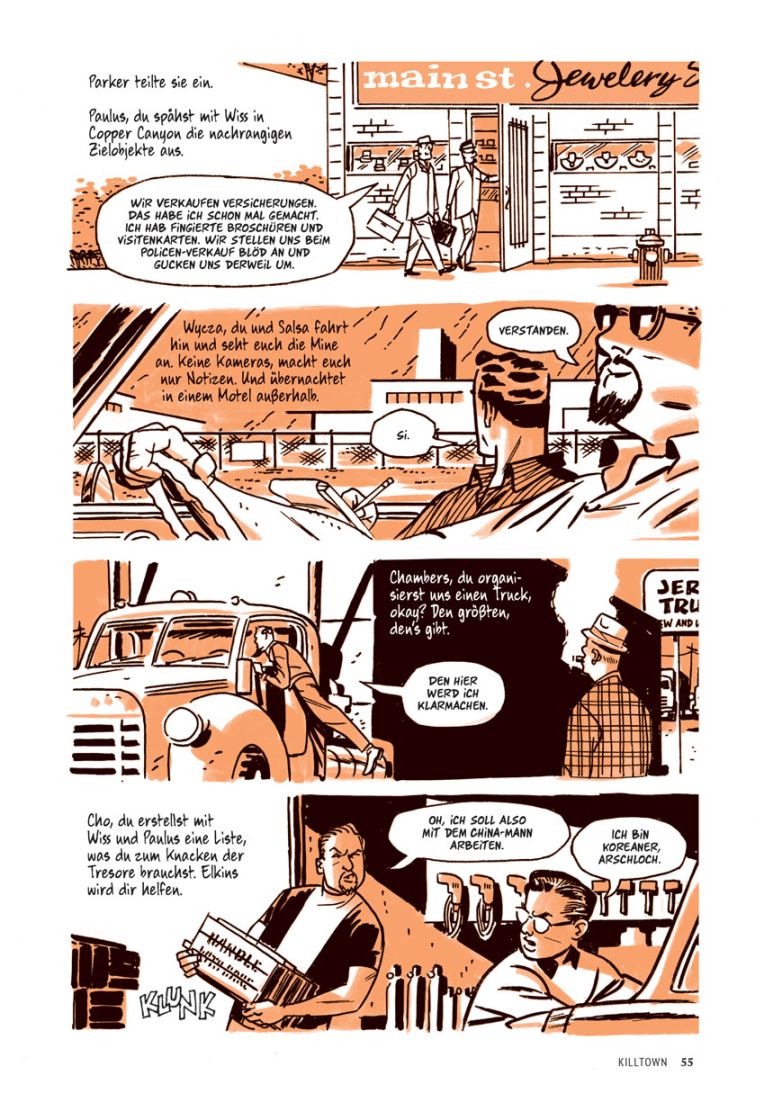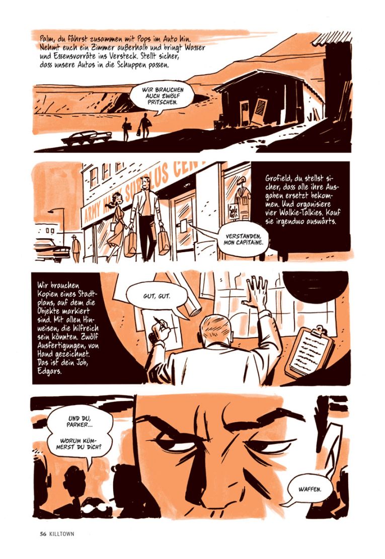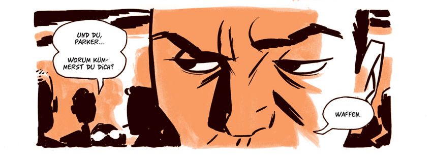 Cooke entscheidet sich für Orange als Farbigkeit. Einerseits um die erdfarbene Hitze des Bergbaus einzufangen, welcher der „Stadt im Würgegriff“ ihren Reichtum beschert. Andererseits schimmert so auch immer etwas von der goldenen Ära durch. Das Storytelling ist ebenso großartig wie wortkarg und effizient. So wie Parker. Aber das braucht inzwischen hoffentlich keine Extraerwähnung mehr.