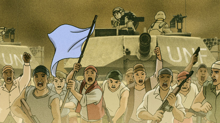 Saeko schießt ein Foto von einer improvisierten Flagge und eben dies Foto wird weltberühmt und leitet die Friedensverhandlungen in Uddyanna ein. Doch die Rebellen stehlen die Flagge und die UN-Einsatztruppe muss das Symbol des Friedens zurückbeschaffen. Saeko soll die Mission offiziell begleiten und dokumentieren, dabei gerät sie in heftige Kriegswirren.