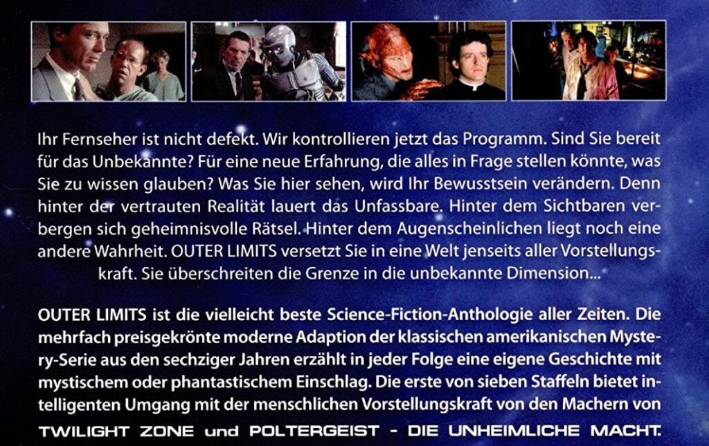 Das Konzept der Serie knüpft ausdrücklich an den Vorgänger aus den 1960er Jahren an. Damals war den Machern ein wahrer Straßenfeger gelungen. Auch die neue Inkarnation der “Outer Limits” entwickelte Kultqualitäten, indem sie nicht einfach nachmachte, sondern weiterentwickelte und modernisierte. Anders als in Mystery-Serien wie “Twilight Zone” geht es in “Outer Limits” um Science Fiction.