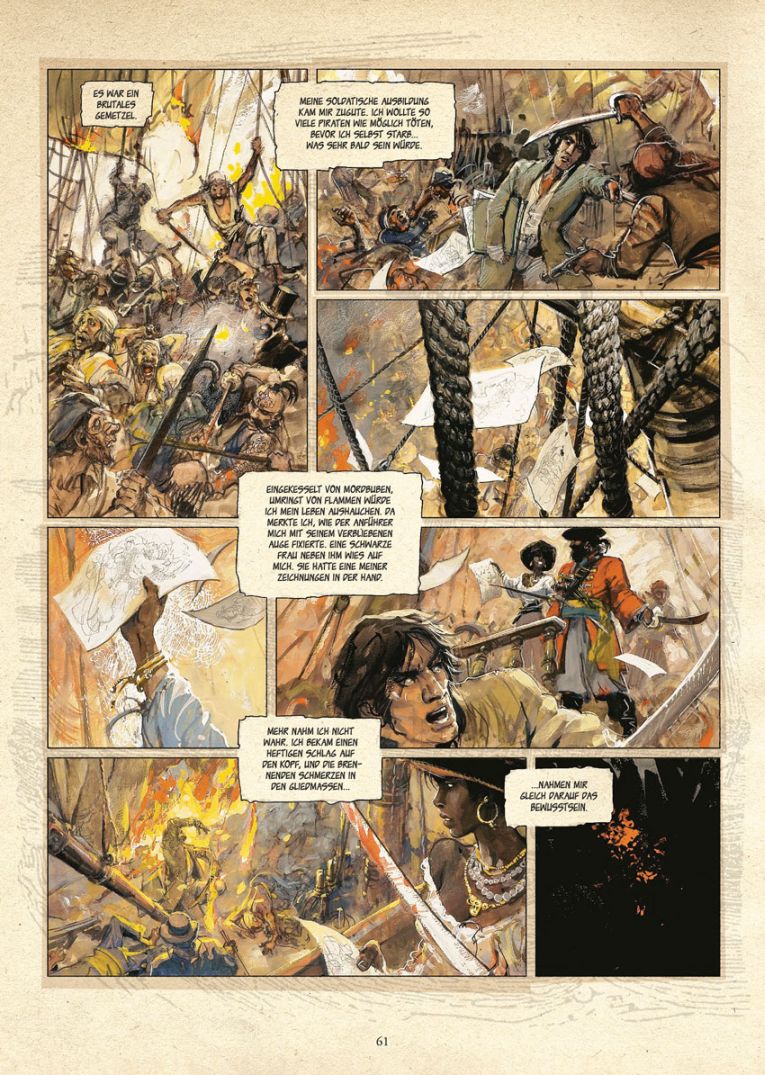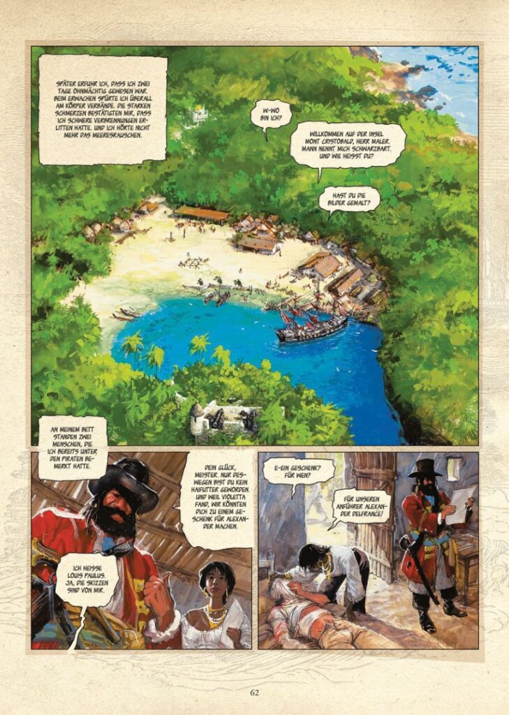 Das Artwork ist der eigentliche Star in „Skarbek“. Die Zeichnungen scheinen durch, die Figuren wirken lebendiger und dynamischer als mit klarer Konturlinie. Die Hintergründe sind hinreißend üppig und vielfältig und detailreich. Beispielsweise ist allein die Kontur der Vorhalle des Gerichtsgebäudes auf Seite 53 eine großartige architektonische Perspektivskizze. Anders, aber nicht weniger faszinierend, sind der Salon von Monsieur Courselle auf Seite 11 oder die karibische Bucht auf Seite 62.