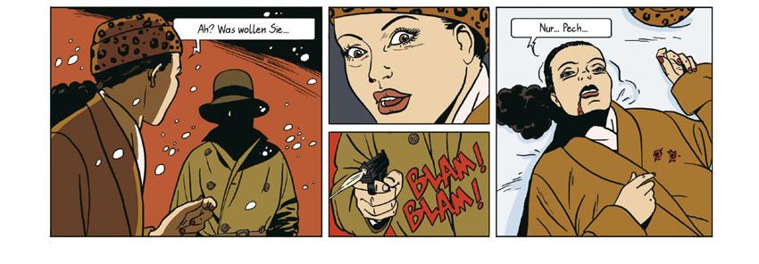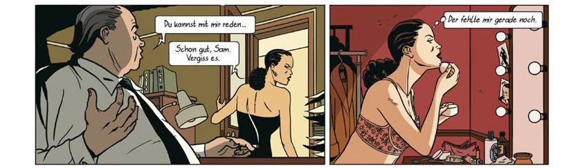 Soweit, so gut, wäre da nicht erneut ein flapsiges Detail in der Erzählung (oder der Übersetzung) das auch ein bisschen ärgerlich auffällt. Während Raul Peggy die Sache mit dem Mord an Roberts Frau erzählt, wird dieser in den Panels bebildert. Dabei ist im der Erzählung von Ehefrau und Freundin die Rede, in der Bildstrecke ist aber nur eine Frau zu sehen. Wenn es dann heißt „Beide Frauen sind sofort tot.“, frage ich mich schon, ob das ungenau ist oder einfach dramaturgisch ungeschickt zugespitzt. Schließlich hätten sich die beiden Frauen ja am Kino voneinander verabschieden können, statt gemeinsam loszugehen.