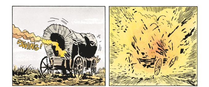 Nur damit wir uns nicht missverstehen, das hat einen eigenen, anderen grafischen Reiz. So ist etwa die nächtliche Sequenz im Bericht von Major Moonroe über die Begegnung mit feindlichen Indianern wunderschön und sehr eigenwillig schwarz aquarelliert beziehungsweise übertuscht. Da lässt sich der Rhythmus des nächtlichen Anpirschens nachempfinden.