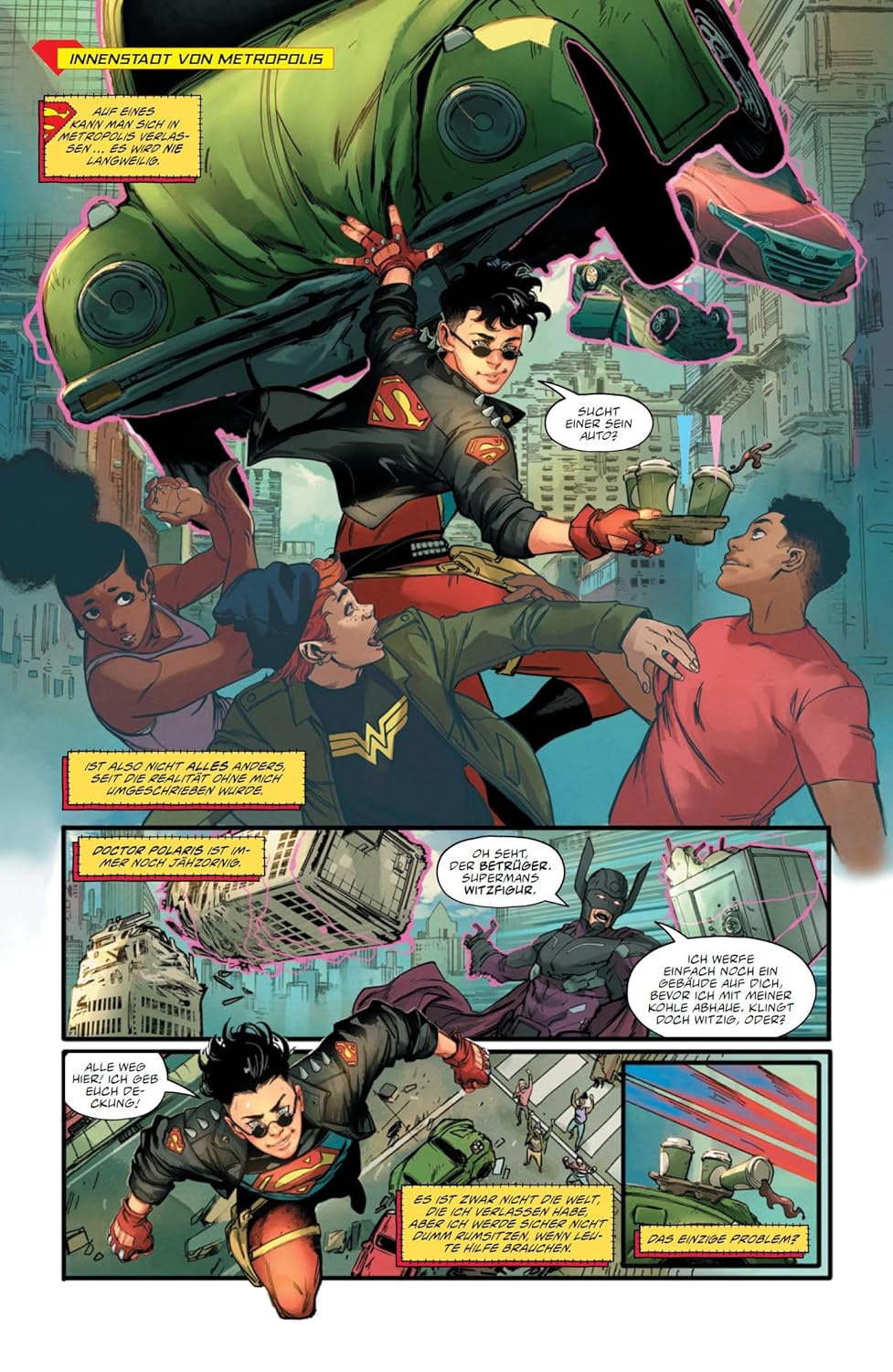 In Metropolis ist eigentlich immer was los und für Metawesen gibt es genug zu tun. So hat Superboy Connor Kent gerade eine jugendliche Gaunerbande hochgenommen als Doctor Polaris andernorts für Stress sorgt. Doch Connor ist zu spät, der andere Superboiy und seine Schwester Supergirl sind schon dabei, die Schäden abzuwenden. Und Supermann lässt sich auch noch blicken und fragt, wie es denn auf der Farm der Kents laufen würde.