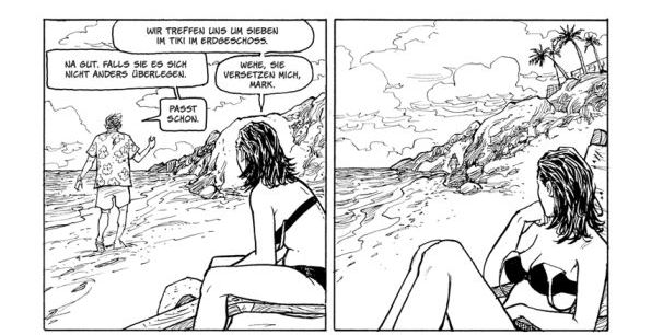 Was das Zeichnerische angeht, so habe ich als Terry Moore Fan, der definitiv keine Farben braucht, das Gefühl, bisweilen ist in den Panels mit heißer Feder gestrickt worden. Einiges, gerade in den Action-Szenen sowie bei den Landschaften und Hintergründen wirkt eher skizzenhaft verhuscht. Eine ganzseitiges Berge- und Wolkenszenario mit Motorradfahrerin im Vordergrund wie auf Seite 27 ließe sich sicherlich auch ansprechender ausformulieren. Auch die ruhige See auf Seite 113 hat alles andere als Strichqualitäten eines Hugo Pratt.