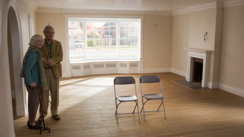 Für einen Film ist das Konzept einer starren Kamerapositition schon ein Wagnis, weil es die Perspektive sehr einschränkt. So entstehen aber gelegentlich auch sehenswerte Tableaus. Der schwedische Filmmacher Roy Andersson („Songs from the Second Storey“) ist da ein Experte. Doch „Here“ geht noch einen Schritt weiter und wechselt über die gesamte Filmlänge nicht den Ort an dem die Handlung stattfindet.