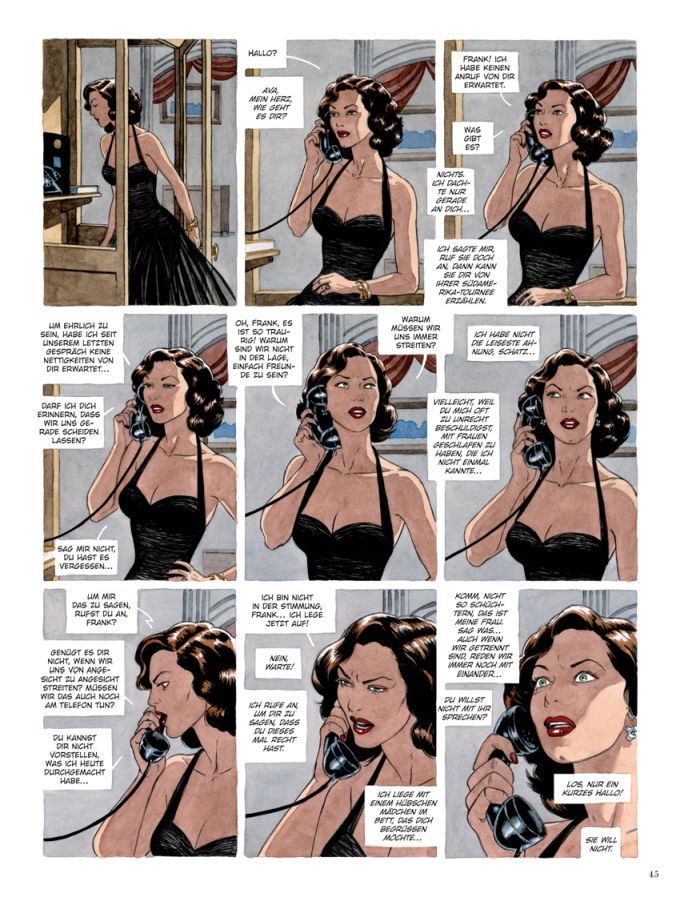 Die Hollywood-Diva Ava Gardner galt als lebenslustige Femme fatale. Während der 48 Stunden von Rio gerät sie in einen Wirbel aus negativer Presse und begehrlichen Anzüglichkeiten, die sie selbst wie einen Roman Kafkas empfindet. Das ist dialoglastig dargestellt und mit klaren Linie und eleganten Schattierungen zu Papier gebracht. Das damalige Gebaren gegenüber der Schauspielerin scheint aus heutiger Perspektive mehr als nur irritierend. Darüber hinaus lässt sich aus dieser Geschichte wenig mehr herauslesen.