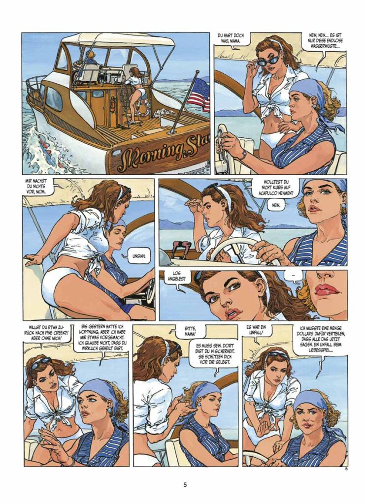 Wie schon zuvor gewürdigt, ist der Stil der Illustrationen keine klassische Ligne Claire, aber von zeitloser Klarheit. Die Panels sind von großer Detailfreude, wo es drauf ankommt, und während der Dialoge unaufgeregt monochrom. Schön ist aber dennoch die Laubfärbung im „Indian Summer“ in Canada und in New Hampshire. Auch der wolkenlos azurne kalifornische Himmel und das klare Meer wissen zu gefallen.