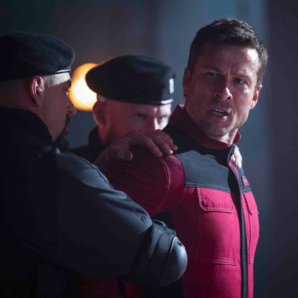 Und so findet sich der wütende Ben Richards als einer von drei Kandidaten für „The Running Man“ wieder. In der Show müssen die Kanditaten 30 Tage in der Gesellschaft überleben. Sie werden von einer Gruppe Jäger verfolgt, die von dem maskierten Evan McCone (Lee Pace) angeführt. Die Kandidaten bekommen 12 Stunden Vorsprung und etwas Geld. Dann beginnt die Jagd und alle Bürger:innen können mitmachen und Hinweise an den Sender und die Jäger weitergeben. Die werden gut belohnt. Werden die Kandidaten von den Jägern gefasst, werden sie getötet. Ben merkt schnell, dass sein Überlebensplan nicht funktioniert und es ohne Hilfe nicht geht.