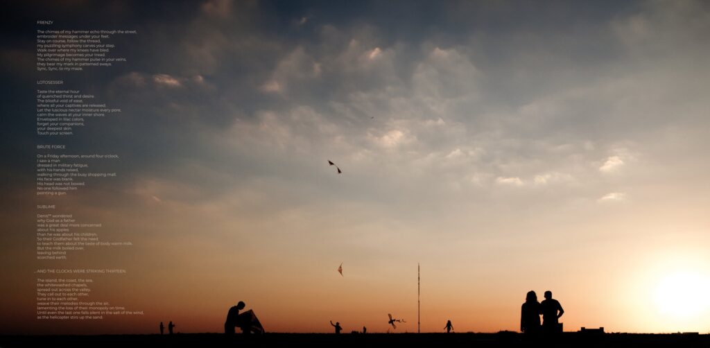 „Lotusesser“ beschwört im Gedicht die ewige Stunde und die drängende Sehnsucht, während musikalisch ein stetig fließender ruhiger Strom heraufbeschworen wird. Gitarrenfiguren wie sie Glen gerne improvisieren schwimmen auf dem Groove. Ein wunderbares charismatisches Auf-und Abschwellen. „Brute Force“ beginnt mit einen distanzierten Saxofon und sich aufbauendem Becken-Zischen bevor nach 90 Sekunden ein hektischer Gitarrenfunk den Song übernimmt. Das hat durchaus etwas von der nervösen Energie die Critters Buggin’ Mitte der Neunziger in Seattle aufs Parkett brachten. Für den einen oder die andere mag das zuviel Bleep und Klong sein und zuviel Saxofon-Gefiepe, aber ich mag die Energie dabei. Das Gedicht dazu erzählt von einem Mann, der mit erhobenen Händen durch eine Einkaufszentrum geht.